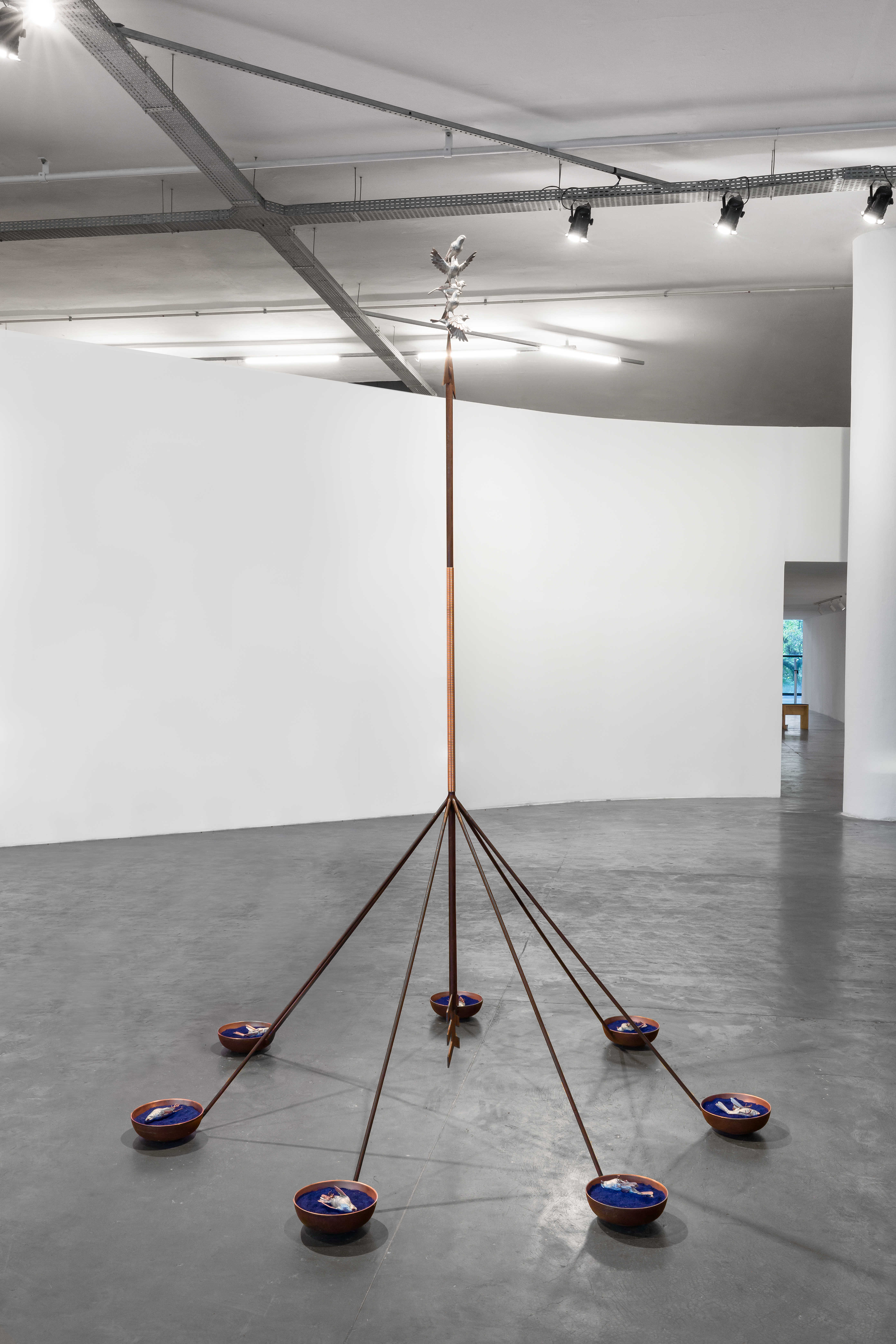 This narrative is the starting point for Luana Vitra’s work at the 35th Bienal de São Paulo. The installation’s central element is a series of arrow-shaped patuás designed to “unblock” paths. Made of iron, a paradigmatic material that recurs throughout her practice, these arrows act as conductors, pointing toward places of prosperity where “possibility prevails.” At the center of the installation, some of the arrows are grouped and positioned diagonally in relation to each other. For Vitra, this arrangement creates a pathway that spatializes the meanings and potentialities each grouping holds. Complementing the composition are copper bowls, birds coated in silver and copper, metals known for their high conductivity, and indigo powder, a substance often used for spiritual cleansing.